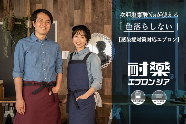 【塩素系漂白剤でも全く色落ちしないカラーエプロン2型を展開】