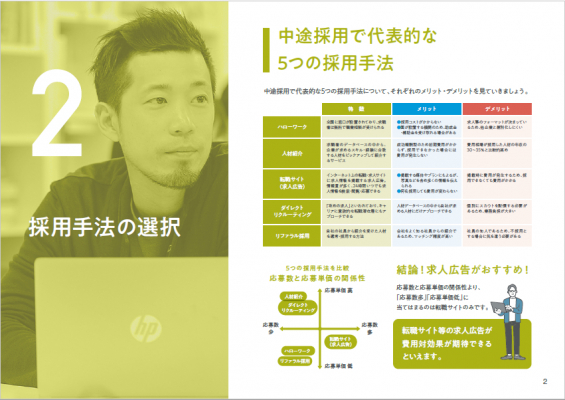 中途採用における理想的な手順や代表的な5つの採用手法についてのメリット・デメリット、フローごとに押さえるべきポイントなど、中途採用に関するノウハウが網羅的にまとまっており、採用成功のヒントがぎゅっと詰まった一冊となっております。