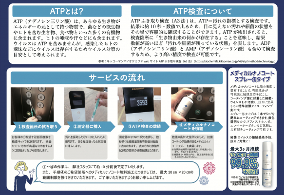 株式会社AND SHIELDでは、不特定多数の人が触れる身の回りの共用部に潜む細菌や汚れを数値で検出できるATP検査と、数値の高い箇所に対し抗菌コーティング施工をする新サービスパックのご提供を通して、皆様の見えない不安を解消するサポートをいたします。