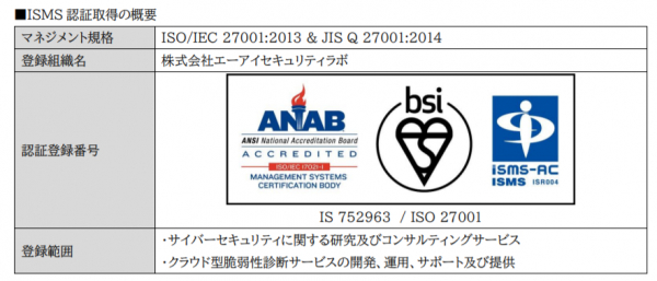 当社は簡単・手軽にWebサービスの安全性向上を実現するSaaS型Webアプリ診断ツール「AeyeScan」を提供しています。事業拡大のなか、お客様にさらなる「安全・安心」なサービスを提供すべく、情報セキュリティ管理体制の強化を進めてまいりました。今回のISMS認証取得は、当社の取り組みが適切に行われていることを第三者機関が認定するものです。