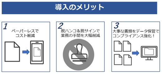 『WEB雇用契約』を活用することで、「ペーパーレス」「脱ハンコ」「脱サイン」が可能となり、ペーパーレス化によるコスト削減や、総務人事部門と従業員間の業務の手間を大幅削減します。また、重要な書類をデータ保管することにより、コンプライアンスの強化が期待できます。