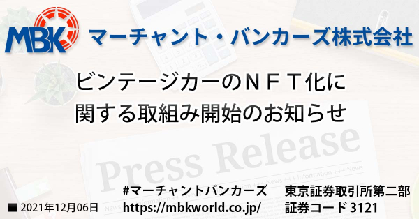 MBKブロックチェーン株式会社は、「NFTバンカーズ」(https://nft-bankers.com/)並びに「NFT LaFan」(https://nft-lafan.com/)にて、お宝グッズをNFT化して売買する事業に取り組んでますが、今般、アイテムを広げ、個人が所有するビンテージカーのNFTに取り組んでまいりますことを2021年12月6日に決定いたしましたので、お知らせします。