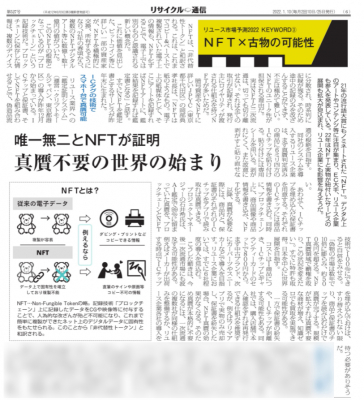 リユース・リセール業界の販売商品画像には、中古品ならではの軽微なキズ、汚れ、その他経年劣化などの特徴が確認できます。その販売商品画像そのものをNFT化することにより、「商品のすり替え防止」等の効果があるという点が着目され、リユース・リセール業界における各社から多くの引き合いをいただいております。こうした背景を鑑み、リユース・リセール業界大手専門紙『リサイクル通信』からも取材を受けました。記事詳細につきましては下記をご参照ください。