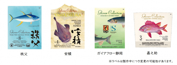 日本各地のクラフトウイスキー蒸留所4社に協力をいただき、本イベントに向けて4樽のオリジナルウイスキーを準備いたしました。いずれのラベルも「グラバー魚譜」の日本画をあしらっております。更にもう1種のボトルも準備中。合計800本を今回のイベント向けに販売予定です。