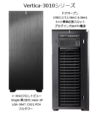 Vertica-3010A/Bシリーズは、LGA-3647 ソケット(ソケットP) 第2世代 Xeon SP(48レーン)CPU 1基が搭載可能な高性能ワークステーションで、2.5”ドライブベイを2台(最大5台)、2.5”/3.5”ドライブ共用ベイを8台(最大18台)、5.25インチベイを2台装備しています。静音性を向上するフロントドアは、取り外しての運用、左開き、右開きでの運用が可能です。