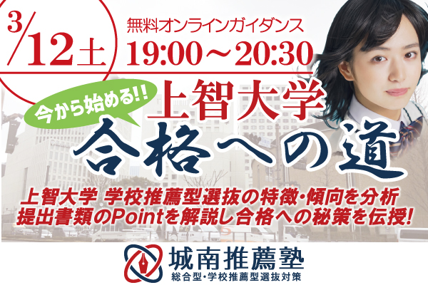 そこで今回「城南推薦塾」では、受験生ができる限り効率良く上智大学に合格するための方法を伝授する無料ガイダンス「今から始める!! 上智大学 合格への道」をオンラインで開催します。上智大学を公募制推薦入試で受験したいと考えているすべての高校生、ならびに保護者の方にご参加いただけます。