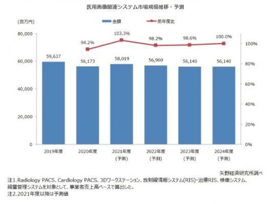 2021年度の医用画像関連システムの市場規模は、消費増税の駆け込み需要の反動減やコロナ禍の影響から回復し、前年度比3.3%増の580億1,900万円と予測する。
