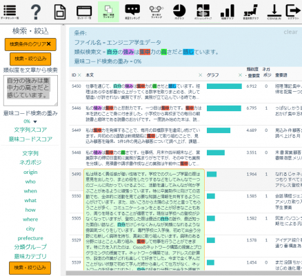 採点支援サービスでは、ヴィジュアル類似検索機能(「AIポジショニングマップMr.DATA」に搭載)が活躍します。文章題、自由作文・小論文や、研修アンケート中のトピック・センテンス、正解文数通りをコピーして画面左上の検索窓にペーストします。すると、そのどれかの部分と類似度が高い順に、ランキング、表示されます。例えば、就活演習で学生達が書いた自己PR文に対して、「自分の強みは集中力の高さだと感じています。」との類似判定をさせると、下図のように、最も類似度の高い他学生の文章から順にランキングされていきます。