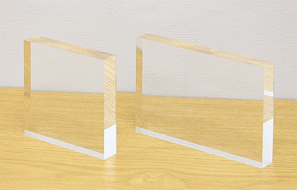 ガラスよりも透明度の高いアクリル製のブロックで国内メーカークラレの押出材を使用。印刷を施し、記念品、ノベルティ、アニメグッズ等のオリジナル製品の材料としてお使い頂けます。100×100mm、148×100mm、150×150mmの3サイズをご用意。