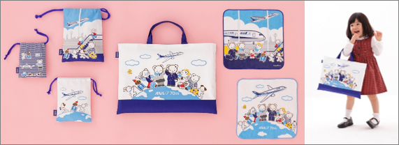 70周年記念デザインの商品は、familiarのオリジナルキャラクター“ファミちゃん”がパイロットに、“リアちゃん”がCA(客室乗務員)になり、その仲間たちとANAの創立70周年をお祝いする様子や、ANAの飛行機に乗ってさまざまな地へ行く空港での風景がデザインされています。レッスンバッグと巾着は両面でデザインが異なり、コラボの証であるfamiliarとANAのロゴ入りピスネームが付いています。