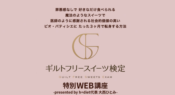 食べるほど健康になる「究極のギルトフリースイーツ」を提唱するh+diet laboratory代表の大西ひとみ氏全面監修により、ギルトフリースイーツの提供を通して、人々の心と体の健康を支えるビオ・パティシエ養成講座である「ギルトフリースイーツ検定」を