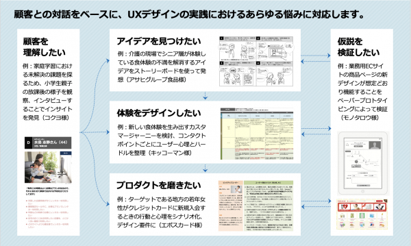本サービスでは、顧客との対話をベースに、UXをデザインの実践におけるあらゆる悩みに対応しております。