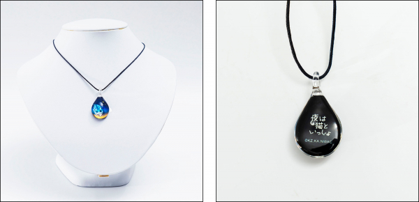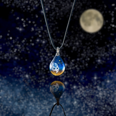 夜空を見上げるキュルガをあしらったガラス製のネックレスは、