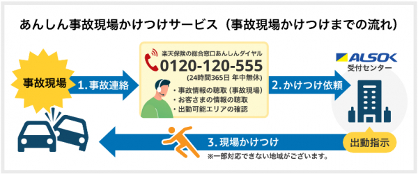(注3)事故現場にALSOK隊員がかけつけるサービスをご利用いただけます。ALSOK隊員は事故現場へかけつけて、事故現場の安全確保、事故状況の確認、事故現場の記録、ロードアシスタンスの出動要請を行います。