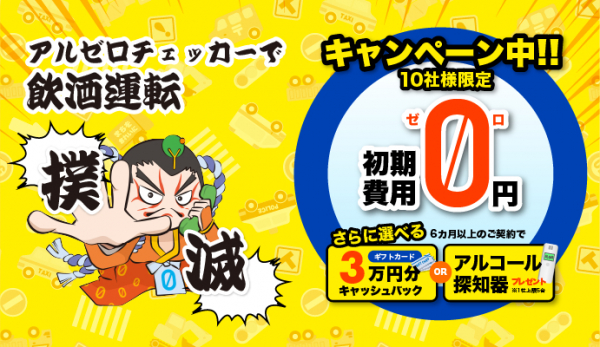 ・初期費用無料でご契約いただいた事業者様を対象に、半年以上のプラン(ミドルプランまたはロングプラン)ご契約でギフトカード3万円分キャッシュバックまたはアルコール検知器5台をプレゼント。