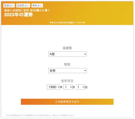 他者との相対的比較による運勢評価を受けたくない人にも、【(1)生年月日(2)血液型(3)性別】の3点を入力することで運勢鑑定やアドバイスだけを受けられる診断機能もあります。