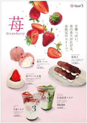 苺クリーム大福 北海道小豆を使用した甘さ控えめな粒あんと、濃厚な生クリームが苺の甘酸っぱさが絶妙なコンビネーション(税込380円)
