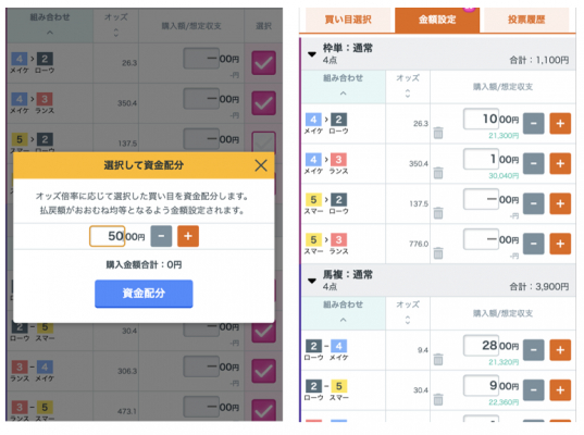 選択して資金配分:選択した買い目のみオッズ倍率に応じて資金配分
