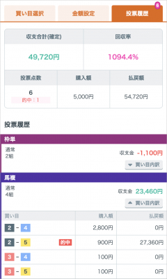 ・レース終了後には保存した買い目の的中結果、払戻金、回収率を表示