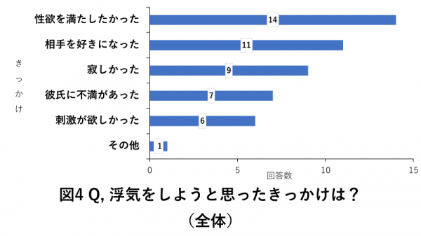 浮気をしたことがあると回答した方の中で、なぜ浮気をしようと思ったのかについて質問を設けたところ「性欲を満たしたかった」という回答が最も多くでていました。