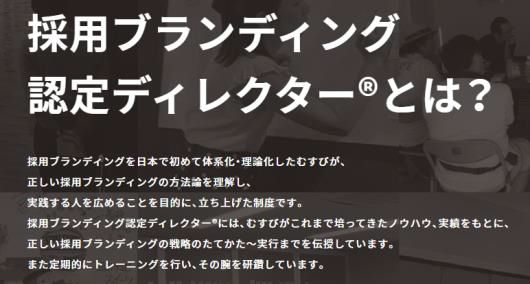 「採用ブランディング認定ディレクター(R) 」は、採用ブランディングを日本で初めて体系化・理論化した当社が、正しい採用ブランディングの方法論を理解し、実践する人を広めることを目的に、2020年11月に立ち上げた制度です。採用ブランディング認定ディレクター(R)には、当社がこれまで培ってきたノウハウ、実績をもとに、正しい採用ブランディングの戦略立案から実行までを伝授しています。また定期的にトレーニングを行い、その腕を研鑽しています。現在までに16名の「採用ブランディング認定ディレクター(R) 」が誕生しました。また、 2022年5月18日、「採用ブランディング認定ディレクター(R) 」の商標登録が完了いたしました。