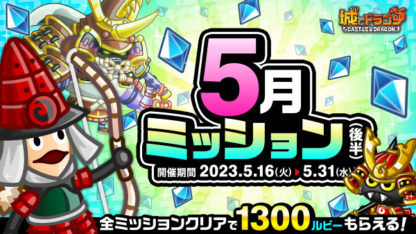 株式会社アソビズム(本社:東京都千代田区、代表取締役:大手智之)は、App Store・Google Playにて好評配信中の『城とドラゴン』で、「5月ミッション(後半)」を2023年5月16日(火)より開催いたします。