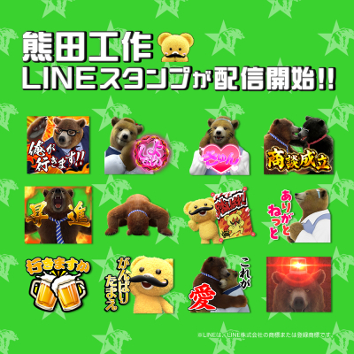 主人公・熊田工作をはじめとした個性あふれるキャラクター達がLINEスタンプに登場!全40種類のLINEスタンプは、日常会話に便利なスタンプだけでなく、クマリーマンの世界観を楽しめるオリジナルトークも含まれています。「課長 熊田工作」のLINEスタンプで梅雨のジメジメ感を笑い飛ばそう!是非、LINEスタンプでも「課長 熊田工作」をお楽しみください。