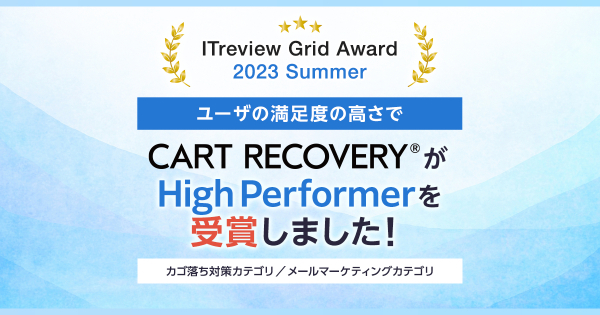 この度「CART RECOVERY(R)」は、アイティクラウド社主催の「ITreview Grid Award 2023 Summer」において、【満足度】においてユーザーから高い評価を受け、カゴ落ち対策カテゴリーのアワード「High Performer」を受賞しました!また今回、メールマーケティングカテゴリーでも「High Pergomer」を受賞いたしました!