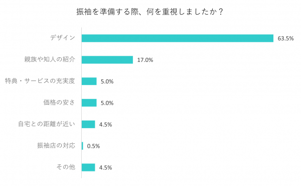 振袖を準備する際に最も重視したポイントをたずねたところ、最も多かったのが「デザイン」で63.5%(前回比+9.5ポイント)でした。次いで「親族や知人の紹介」17%(前回比+2.5ポイント)、「特典・サービスの充実度」5%(前回比+2ポイント)、「価格の安さ」5%(前回比-4.5ポイント)、「自宅との距離が近い」4.5%(前回比-0.5ポイント)。「振袖店の対応」0.5%(前回比-2ポイント)と続きます。「その他」の回答として、「母から譲り受けたものがあったので特に重視した部分はない」「祖母の用意したものを着ると決まっていた」などが挙げられました。