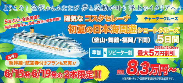 コスタクルーズ社の協力のもと、株式会社ベストワンドットコムのチャーターにより実現したこの企画は、コロナ禍からの復活の象徴になるような新しい日本海周遊クルーズの歴史を創ることを目指しています。コスタクルーズは、2016 年の日本初就航時に金沢を発着港に指定するなど、以前から金沢を重要な拠点と位置付けてきました。2019 年以来 5 年ぶりの再開となる今回は、コスタビクトリア、コスタネオロマンチカに続き、コスタクルーズ社としては過去最大級のコスタセレーナにて、2020年完成の新しい金沢港クルーズターミナルから初就航します。