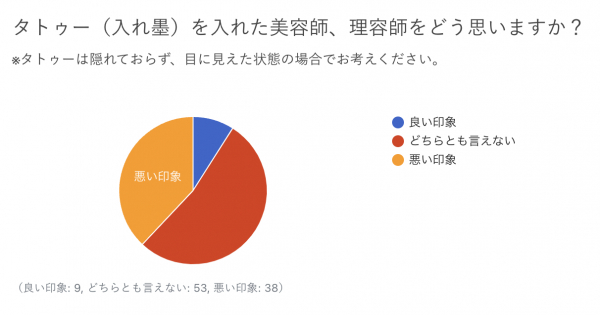 タトゥー(入れ墨)を入れた美容師、理容師の印象について、“良い印象”が9%、“どちらとも言えない”が53%、“悪い印象”が38%でした。
