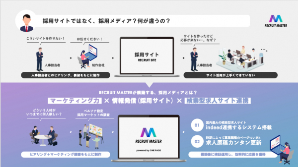 これに対し「リクルートマスター」は認知・興味から内定までの、採用メディア制作から運用・応募管理・人事フローの仕組み化まで、一貫して伴走します。