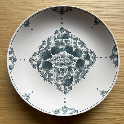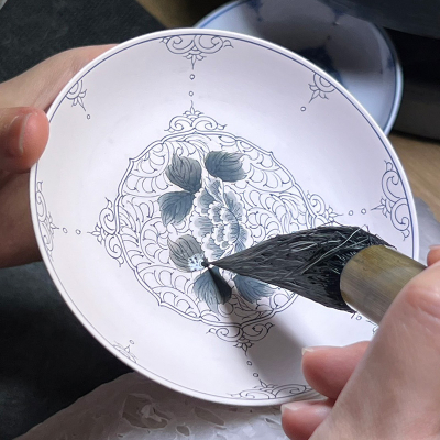 長崎の伝統工芸「三川内焼」の人気体験シリーズ。平戸松山窯が得意とする優美な染付の牡丹唐草を施した豆皿に「濃み(だみ)」という技法で、お好きな箇所を塗っていただきます。
