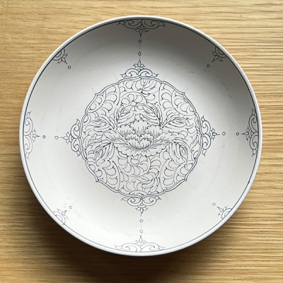 平戸松山窯の代表的な絵柄のひとつである「間取牡丹唐草」の染付に「濃み(だみ)」という技法を使用します。
