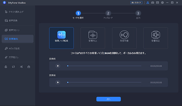 ボーカル抽出、ノイズ除去、音量同一化、発音修正は全てワンクリックで自動的に行え、騒がしい環境で収録された音声がクリアになれて再利用できます。