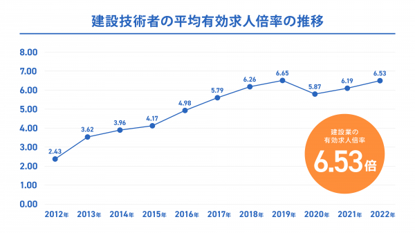 また、建設業界の有効求人倍率は、2022年平均で約6.53倍(※)と高い水準が続いており、深刻な人材不足に陥っています。特に経営資源が限られる中小企業にとって、採用活動に割く時間や求人誌・求人サイトといった掛け捨ての媒体を利用するコストが大きな負担となるため、人を採用したくともなかなか積極的に動くことができないという課題を抱えています。