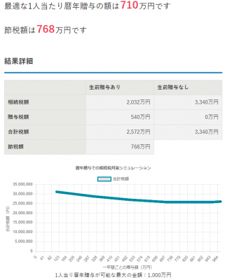 いくら生前贈与すれば節税額が最も大きくなるか、簡単にシミュレーションします。