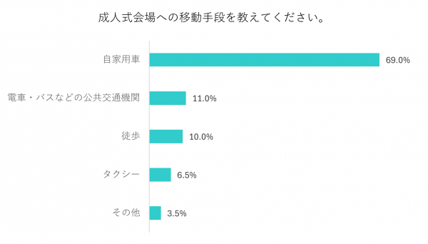 成人式会場への移動手段をたずねたところ、最も多かったのが「自家用車」で69%(前回比+0.5ポイント)でした。次いで「電車・バスなどの公共交通機関」11%(前回比-5ポイント)、「徒歩」10%(前回比+3ポイント)、「タクシー」6.5%(前回比-1ポイント)、「その他」3.5%(前回比+2.5ポイント)と続きます。