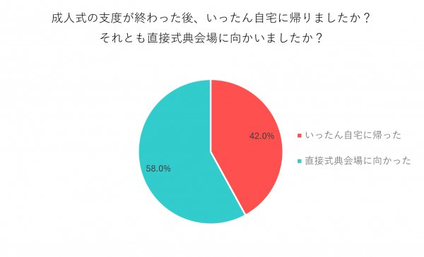 成人式の支度が終わった後、いったん自宅に帰った人は全体の42%。前回調査と比べると12.5ポイント減少していることがわかりました。
