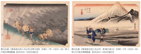 「東海道五拾三次之内」中の富士山を描いた作品や、他シリーズで「深川万年橋」など北斎と同じ場所を描いた作品には、広重による北斎作品への意識が感じられます。ぜひ風景版画の双璧・北斎と広重の作品をこの機会に比較して見てください!