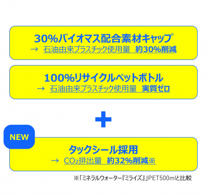 従来の「ミライズ」で採用していたOPPフィルムのロールラベルから、小面積(縦50mm×横35mm)のタックシールを採用し貼付することで、従来のロールラベルと比較して約32%のCO?排出量削減※に貢献します。