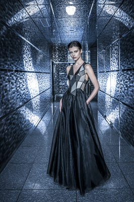 キッチンに採用される特殊な加工によって色付けされたステンレスを人体の立体の形状に合わせカット、配置し、色の 違いや表面の凹凸により生まれる表情、ステンレスの持つ特有の光沢感、シャープなイメージをドレスと融合させ洗練 された美しさを表現。(ATSUSHI NAKASHIMA)