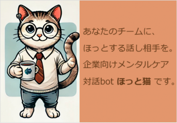 “ほっと猫”は、企業のスタッフが自身のメンタルケアを行うための対話ボットです。24時間365日応答することで、いつでもどこでも利用可能です。特に、人に直接相談しづらい問題や気持ちを吐露しやすいという特徴を持ち、社員のメンタルヘルスケアをサポートします。