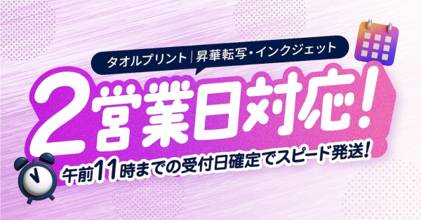 これまでタオルプリントの最短納期は4営業日以内発送でしたが、2・3営業日以内発送に対応しました。
