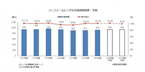 2024年度のユニフォームレンタル市場規模は、前年度比1.6%増の940億円、2025年度の同市場規模は同0.5%減の935億円を予測する。