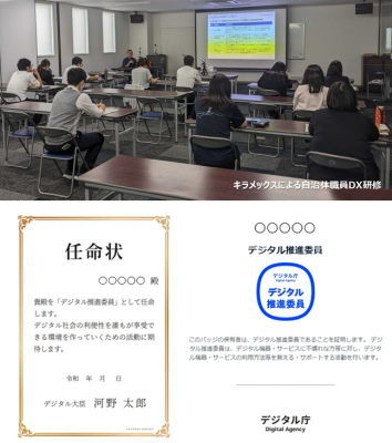 宇陀市のDX化を進めるにあたり、市役所内各担当課に1名以上、合計50人のDXプロ人材を育成します。当機構法人会員のキラメックスによる「6カ月間のDXプロフェッショナル研修」によって受講者全員が「DXアドバイザー」資格を取得し、さらにはデジタル庁「デジタル推進委員」の認定を申請予定です。自治体内にDXプロ人材を育成し、自治体内のみならず、地域事業者のDX推進を自治体DXプロ職員自らが支援する「全国自治体初となるモデルケース」として、全面的に支援します。