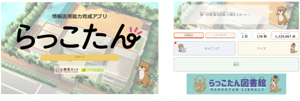 『らっこたん』は、株式会社教育ネットと株式会社ミラボが共同で開発を行っている情報活用能力の可視化・育成を目的としたWEBアプリケーションです。「タイピング等の基本的な操作」や「情報モラル・セキュリティ」、「課題の設定」、「情報の収集」、「整理・分析」、「まとめ・表現」などを学ぶことができます。子どもたちは小学校1年生から中学卒業までの技能習得の進捗を自己確認でき、先生は学校全体・学年・学級・個人の視点から学習状況を把握することが可能です。