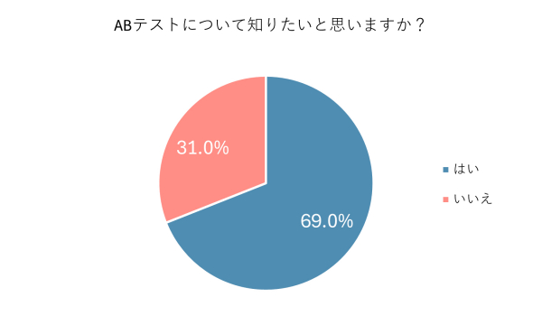 ABテストについて知りたいかたずねたところ、全体の69%が「はい」と回答しました。ABテストの認知度は低いものの、ABテストに対する関心の高さがうかがえます。