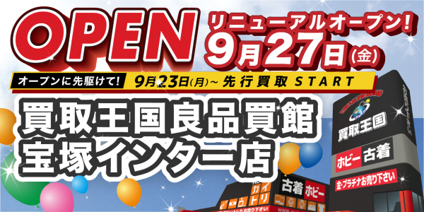 「買取王国良品買館 宝塚インター店」が2024年9月27日(金)にリニューアルオープンいたします。リニューアルオープンに伴い、オープニングイベントを開催いたします。大変お得な4日間となりますので是非ご来店ください。