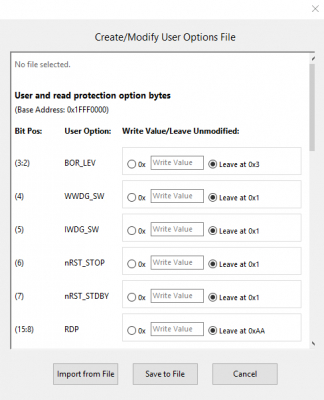 「Import from File」 オプションを選択すると、開発者は既存の.OPTファイルを選択して修正することができます。ファイルに指定された値は適切なフィールドに表示され、その後、開発者はファイルの内容を必要に応じて変更できます。修正したファイルは、元のファイルに上書きするか、別のファイル名で保存できます。